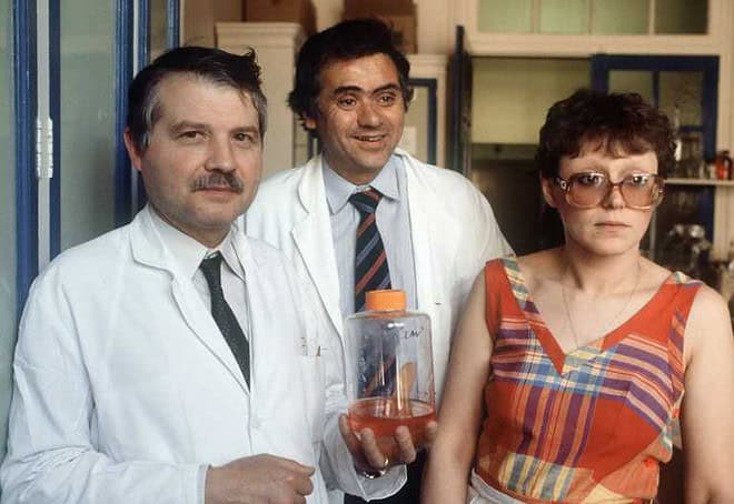 Os professores Luc Montagnier, Jean-Claude Chermann e Françoise Barre-Sinoussi, em seu laboratório do Instituto Pasteur em Paris, em 25 de abril de 1984 – AFP/Arquivos