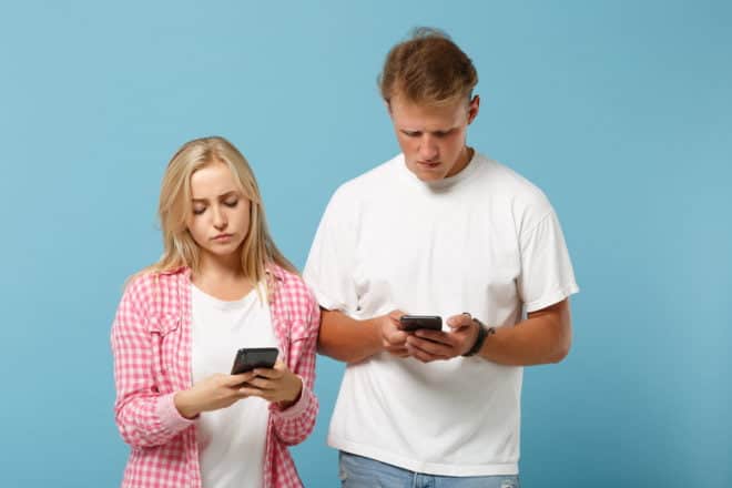 Young upset couple friends guy girl in white pink empty blank t-shirts posing isolated on pastel blue background. People lifestyle concept. Mock up copy space. Using mobile phone, typing sms message