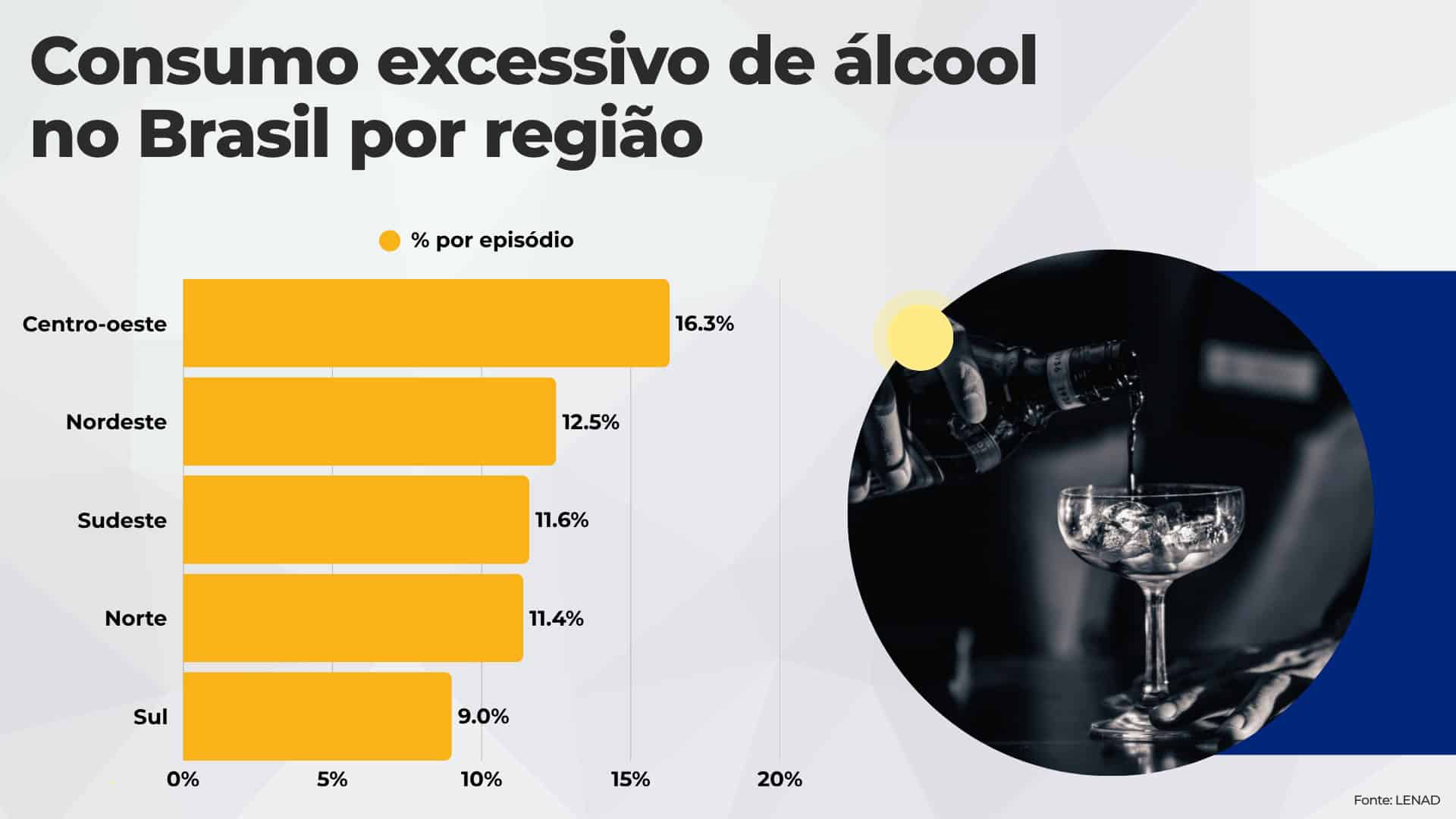 Quanto às diferenças regionais, o Sul e o Centro-oeste apresentam as taxas mais altas de consumo, com 71,4% e 70,1% da população declarando ter bebido no último ano, respectivamente. O Sudeste registra 61,4%, o Nordeste 62,1% e o Norte 60,7%. No entanto, as taxas de consumo excessivo em episódios variam: o Centro-oeste lidera com 16,3%, seguido pelo Nordeste com 12,5% e pelo Sudeste com 11,6%.