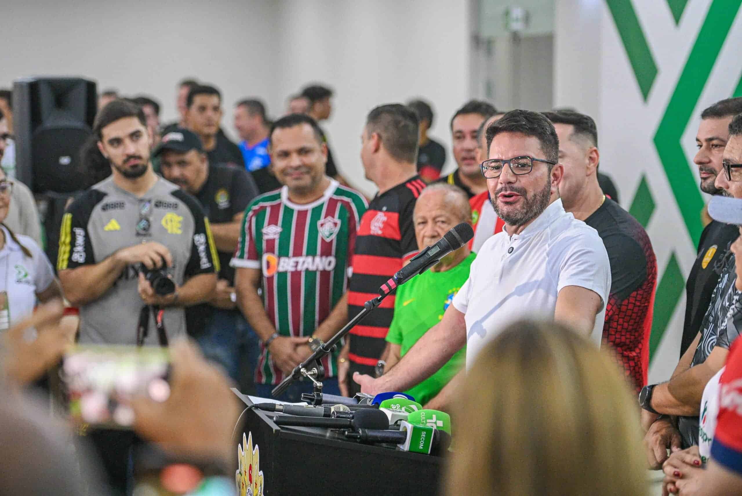 O governador Gladson Cameli celebrou a reinauguração do estádio Arena da Floresta, em Rio Branco, durante um evento histórico marcado por um amistoso entre o Flamengo e o Santa Cruz do Acre. Foto: assessoria