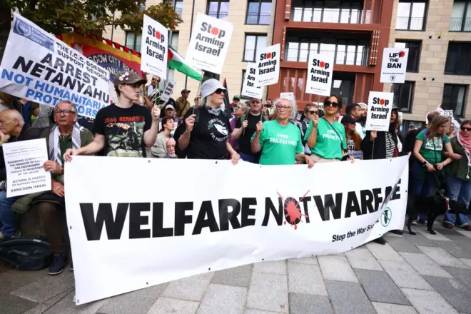 Pessoas participam de um protesto da Ação Palestina em 6 de setembro de 2025 em Edimburgo, Reino Unido • Foto de Annabelle Chih/Getty Images