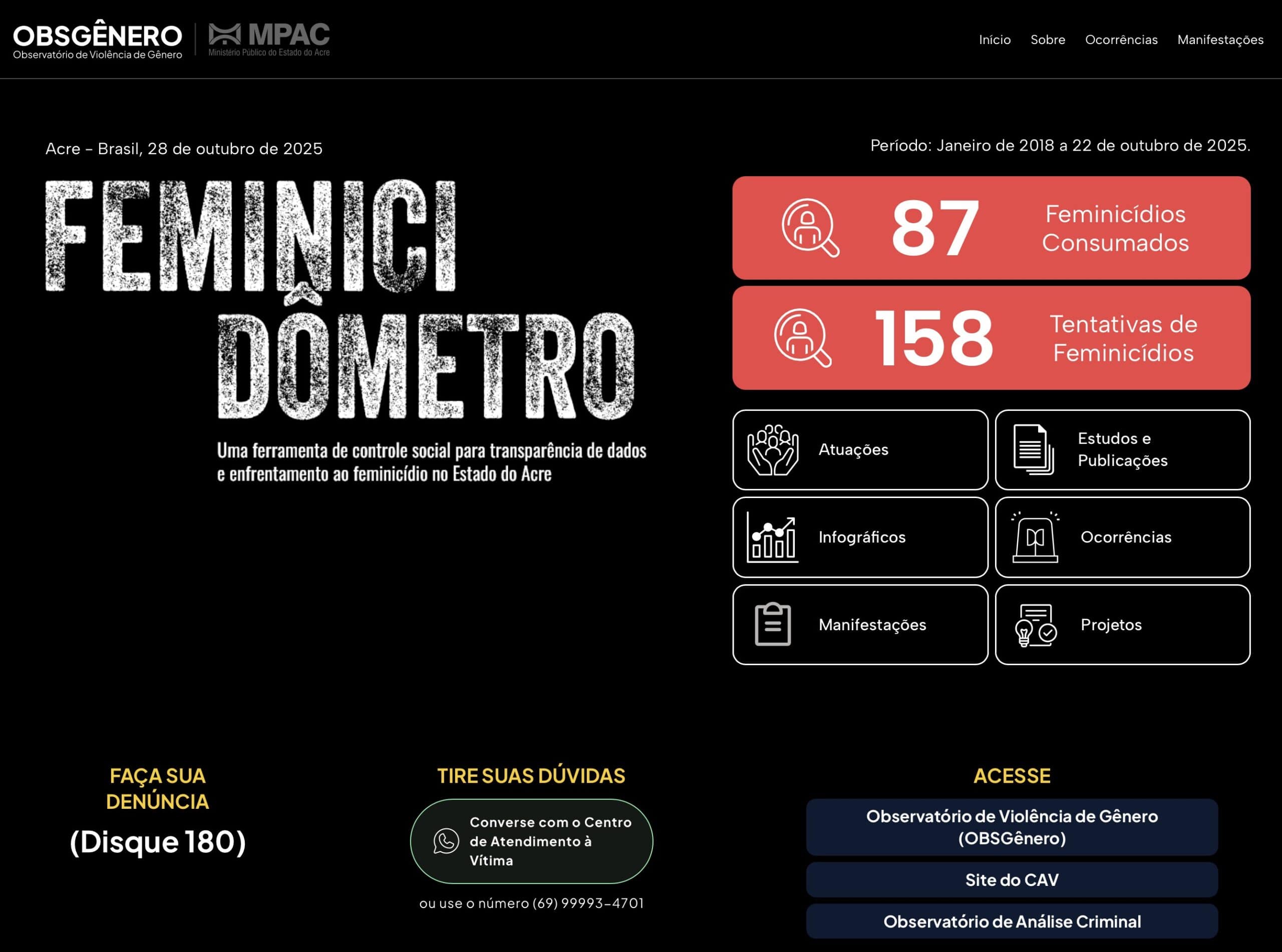 De acordo com os dados do observatório de violência de gênero do Ministério Público do Acre, o número de feminicídio consumado, de 2018 a 2025, somam- se 87 e 158 tentativas contra a mulher. Como nos mostra o gráfico:feminicidometro.mpac.mp.br