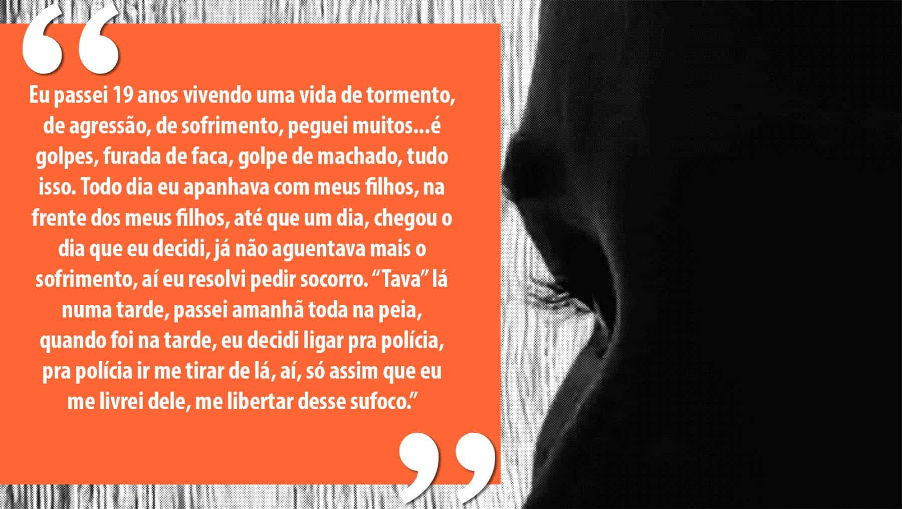 “Eu passei 19 anos vivendo uma vida de tormento, de agressão, de sofrimento, peguei muitos…é golpes, furada de faca, golpe de machado, tudo isso. Todo dia eu apanhava com meus filhos, na frente dos meus filhos, até que um dia, chegou o dia que eu decidi, já não aguentava mais o sofrimento, aí eu resolvi pedir socorro. “Tava” lá numa tarde, passei amanhã toda na peia, quando foi na tarde, eu decidi ligar pra polícia, pra polícia ir me tirar de lá, aí, só assim que eu me livrei dele, me libertar desse sufoco.” contou a nossa reportagem.