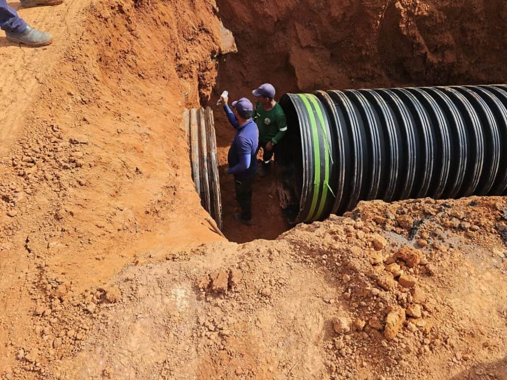 O serviço consiste na instalação de tubo em Pead (polietileno de alta densidade), com diâmetro de 1,50m, estrutura utilizada para condução das águas pluviais sob a pista. A intervenção corrige pontos de acúmulo de água e evita a infiltração no corpo da estrada, reduzindo riscos de danos ao pavimento. A execução do serviço garante melhores condições de tráfego no local e integra as ações de manutenção da malha viária estadual realizadas pelo Deracre.