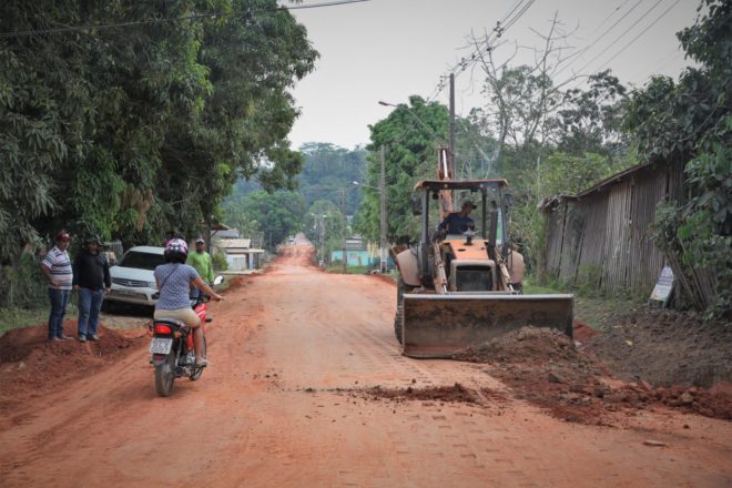Máquina trabalha na pavimentação de rua para receber asfalto em Assis Brasil; recursos são de emendas de bancada de Gladson Cameli e Major Rocha Foto: Odair Leal/Secom