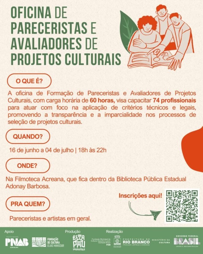 Estão abertas as inscrições para a Oficina de Formação de Pareceristas e Avaliadores de Projetos Culturais, que acontece de 16 de junho a 4 de julho, com carga horária de 60 horas. O curso é gratuito e visa capacitar 74 profissionais do setor cultural para atuarem na análise de projetos com foco na aplicação de critérios técnicos e legais, promovendo transparência, imparcialidade e valorização da diversidade cultural.