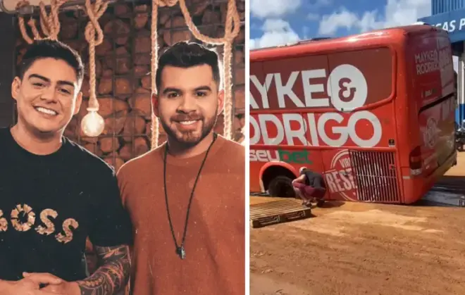 O ônibus da dupla sertaneja Mayke e Rodrigo, de Rondônia, atolou em uma rua de Rio Branco (AC) na manhã desta sexta-feira, 2, ao chegar à capital acreana para a realização de um show.