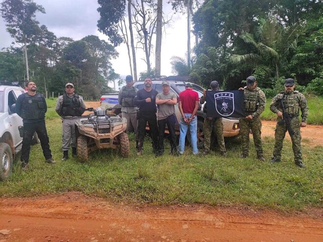 Cerca de duas horas e meia da cidade, em um local de difícil acesso dentro da mata, o acusado foi localizado na região chamada de Colocação Maloca, onde foi cercado e não reagiu, sendo rendido e algemado.