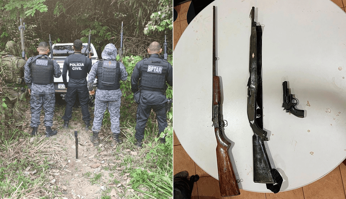 Ação resultou na apreensão de duas armas, um simulacro, duas motocicletas com restrição de roubo, televisão e uma caminhonete roubada. Foto: cedida/montagem
