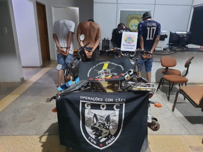 Uma operação deflagrada pelo Comando do 5º Batalhão da Polícia Militar do Alto Acre, com apoio dos agrupamentos GOC e GIRO, resultou na prisão de três suspeitos maiores e apreensão de um menor, de armas, motos e objetos roubados na noite deste sábado (16), em Brasileia, região de fronteira.