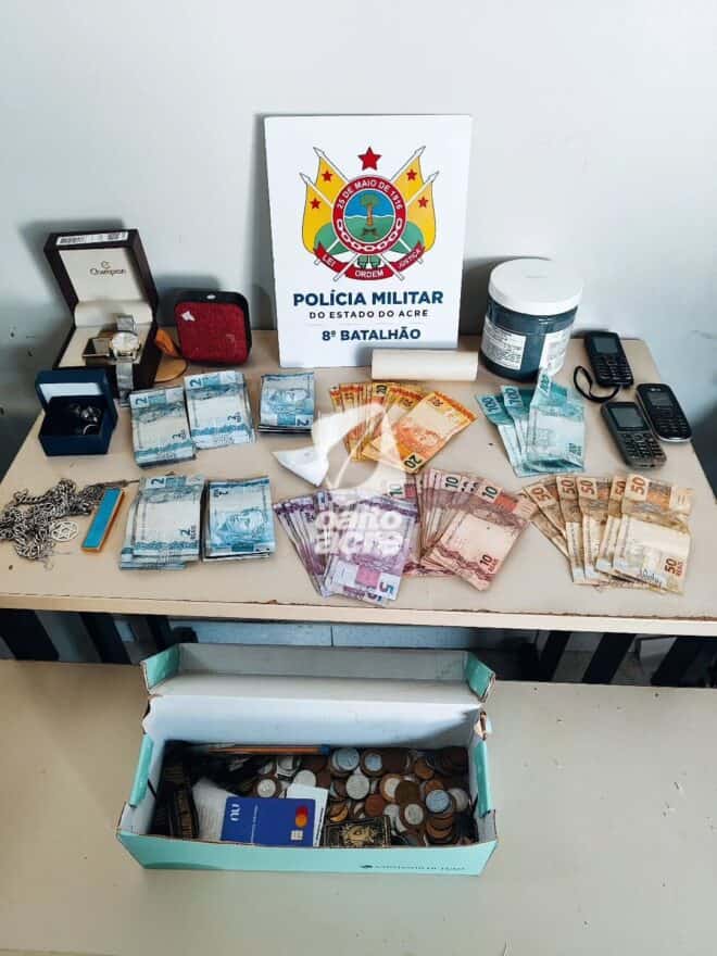 Na residência dele, policiais apreenderam dinheiro em espécie, porções de entorpecente semelhante à cocaína e aparelhos celulares. Um homem e uma mulher foram detidos e conduzidos à Delegacia de Polícia Civil, onde permanecem à disposição da Justiça.