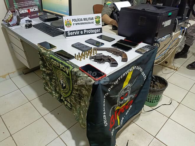Um revólver calibre 38 sem marca municiado e outras munições, uma escopeta calibre 28 foram apreendidas, além de 10 aparelhos de celular um destruído, que não conseguiram destravar.