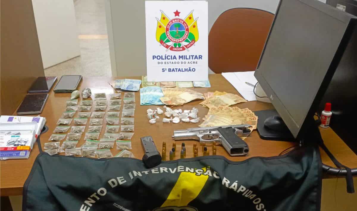 Ao chegarem ao local, os policiais do GIRO notaram que um dos indivíduos tentou fugir em direção ao Rio Acre, enquanto outro foi contido e preso no local. Com ele, foi encontrada uma grande quantidade de drogas já embaladas para venda, configurando tráfico de entorpecentes, conforme o Artigo 33 da Lei de Drogas (Lei nº 11.343/2006), com pena de reclusão de cinco a quinze anos.