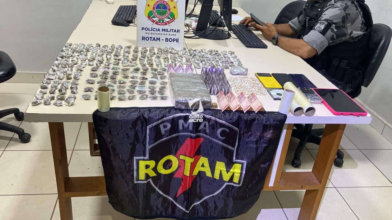 Na varredura realizada na área, os militares apreenderam 106 pinos de cocaína pura, 54 porções de maconha, um tijolo de maconha pesando 1,030 kg, 173 pedras de crack, 231 invólucros de maconha, além de cerca de R$ 60, uma balança de precisão e materiais para embalagem.