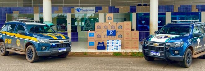 Receita Federal, Polícia Rodoviária Federal, Gefron, Polícia Federal apreenderam cerca de 23,5 mil maços de cigarros contrabandeados num veículo de passeio na BR 317, por volta das 5h30 desta sexta-feira, dia 14.