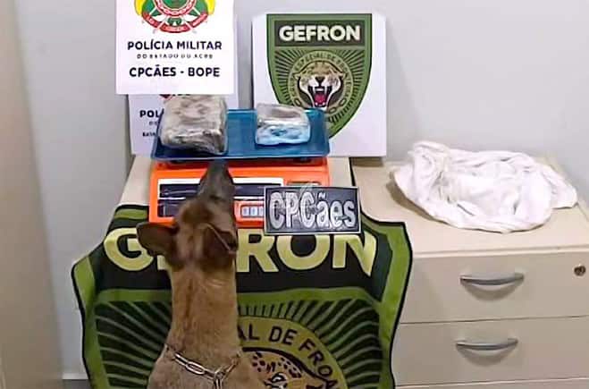 Durante as abordagens, uma ordem de parada foi dada a um ônibus intermunicipal, prefixo 830, que fazia a linha Brasiléia/Rio Branco. Ao inspecionar o veículo e os pertences dos passageiros, com o auxílio do cão K9 MAIA, foi encontrada uma quantidade de substância entorpecente análoga à maconha do tipo ‘skunk’.