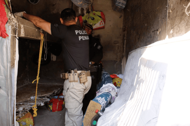 Equipes da Divisão Penitenciária de Operações Especiais (Dpoe), da Divisão do Serviço de Operações e Escolta (Dsoe) e da Divisão de Operações com Cães (DOC), em conjunto com a Polícia Penal Federal e a Força Integrada de Combate ao Crime Organizado (Ficco), participaram da ação.