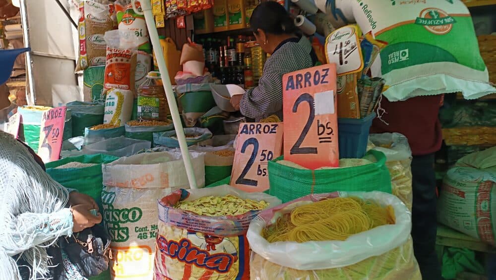 Durante um passeio pela rua Antonio Gallardo, no bairro Gran Poder, ficou evidente que o custo de um grão de arroz dourado de primeira qualidade, que em junho era oferecido entre 300 e 350 bolivianos, permanece o mesmo preço. Os custos variam de acordo com as marcas e qualidade do cereal, já que o arroz popular pode ser encontrado a partir de 260 bolivianos, há cerca de seis meses era entre 170 e 180 bolivianos.