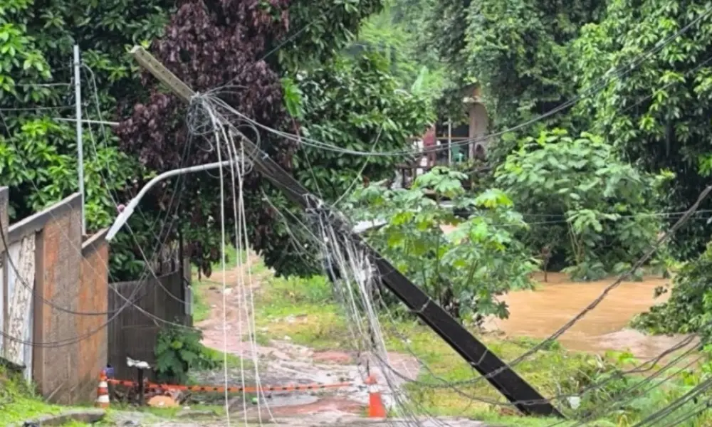 Com o grande volume de água, o solo cedeu, causando desbarrancamento e derrubando o poste, que ficou inclinado sobre a via, com fiação espalhada. A situação representa risco para moradores e para quem transita pelo local, além de afetar o fornecimento de energia na área.