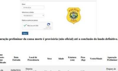 Site começou a funcionar na sexta-feira (1) para o IML de Rio Branco. Plataforma terá dados pessoais e causa da morte de vítimas, diz DPTC. G1...