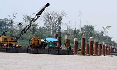 Os balseiros que desceram pelo Rio Madeira, por causa da enchente nas cabeceiras, se acumularam junto à margem onde esta sendo construída a estrutura da Ponte...