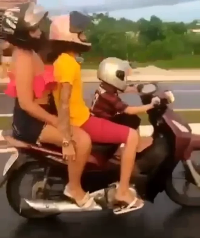 Pelas imagens é possível ver que a criança pilota a moto enquanto um homem e uma mulher comemoram na garupa. O menino é tão pequeno que não alcança o pedal do veículo.