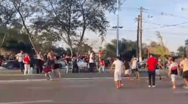 Vídeos que circulam nas redes sociais mostram pelo menos duas brigas, sendo uma generalizada que envolveu vários jovens que trocaram socos e pontapés.