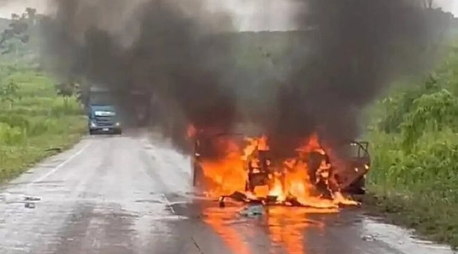 Ao abrirem o capô do veículo, uma explosão ocorreu, impossibilitando qualquer tentativa de controlar as chamas.