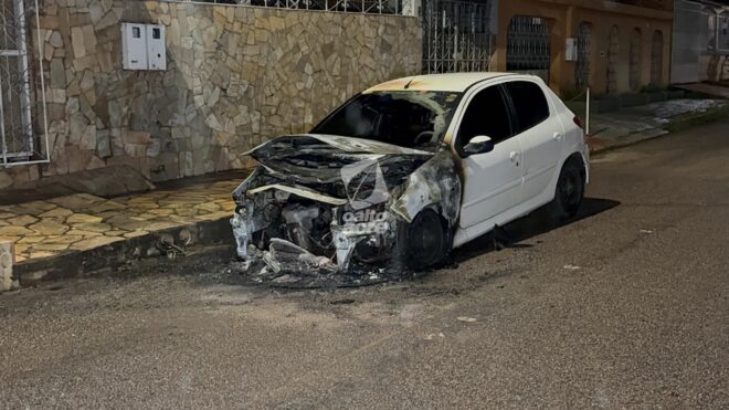 Um veículo modelo Peugeot foi destruído por um incêndio na noite desta terça-feira (10), na Rua Machado de Assis, no Conjunto Castelo Branco, em Rio Branco. O fogo teria sido provocado por uma pane elétrica no motor do carro.