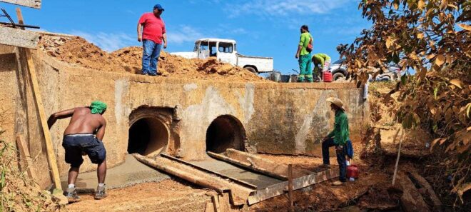 A Prefeitura do Município com Recursos Próprios (RP), iniciou a instalação de bueiros com maior capacidade no Igarapé Balanço, concluindo os trabalhos nesta quinta-feira, 27, com duas linhas de ductos, com capacidade de mil milímetros de vazão d’água, cada linha.