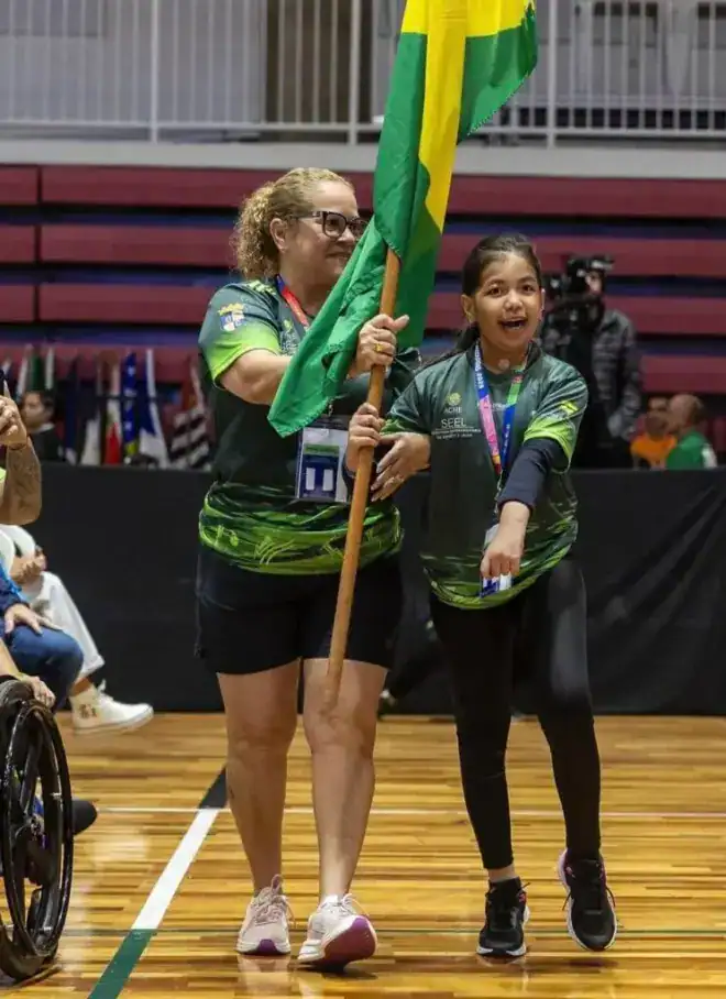 Foto divulgação: Shirlei Lessa com a paratleta Danika Kei na abertura dos Jogos nessa segunda