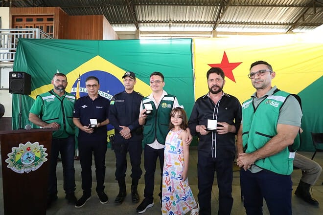 Na ocasião, o presidente Leandro Domingos e o vice-presidente do Sistema Fecomércio Acre, Marcos Lameira, foram agraciados com a moeda da segurança pública das mãos do Secretário de Estado de Justiça e Segurança Pública, coronel José Américo de Souza Gaia, como forma de celebrar e recordar a primeira turma de formandos em cursos desse tipo de serviço no estado do Acre.