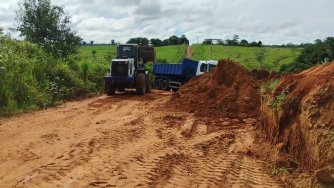 No quilômetro 13, Linha 8, a equipe trabalha visando melhorar as condições de trafegabilidade, com serviços de melhoramento dos pontos críticos, corte de ladeiras, recuperação de pontes e colocação de bueiros.