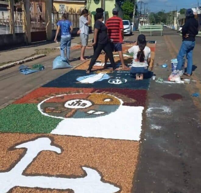 Há alguns anos, a responsabilidade por esse trabalho de confecção dos tradicionais tapetes é delegada aos grupos de catequistas, que também contam com a colaboração de crianças, famílias e outras pessoas da comunidade. Neste ano, serão cerca de 80 metros de tapete.