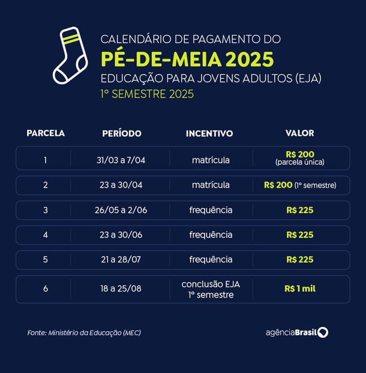 Confira os demais prazos do calendário do Pé-de-Meia 2025 para o EJA, relativo ao primeiro semestre.