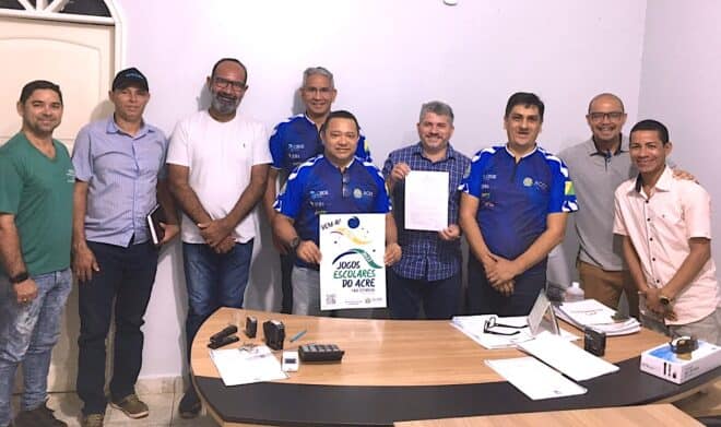 Pela primeira vez o município de Epitaciolândia vai sediar os Jogos Escolares nas fases municipal e estadual, o prefeito Sérgio Lopes recebeu nesta terça, dia 24, o representante do Departamento de Esporte, Junior Santiago, junto com Cleomar Portela, Diretor do Núcleo de Estadual de Educação, para firmar parcerias na realização dos jogos.