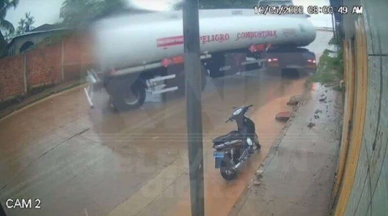 Uma carreta tanque de combustível perdeu o controle e colidiu contra uma casa no bairro Petrolero, em Cobija, capital do departamento de Pando, na fronteira com às cidades de Epitaciolândia e Brasiléia. Câmeras de segurança de registraram o momento do acidente, que causou danos graves à estrutura da residência e destruiu duas motocicletas estacionadas no local.