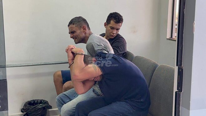 No final da tarde desta quinta-feira (23), policiais militares do 2° Batalhão prenderam Carlos Eduardo Alves de Farias, 43 anos, Rogério Scramossin Farias, 20, e Renê Lins do Carmo, 32, acusados de roubo de veículo, assalto à mão armada, porte ilegal de arma de fogo e resistência à prisão. A ação ocorreu na Rua Peru, no bairro Baixada da Habitasa, em Rio Branco.