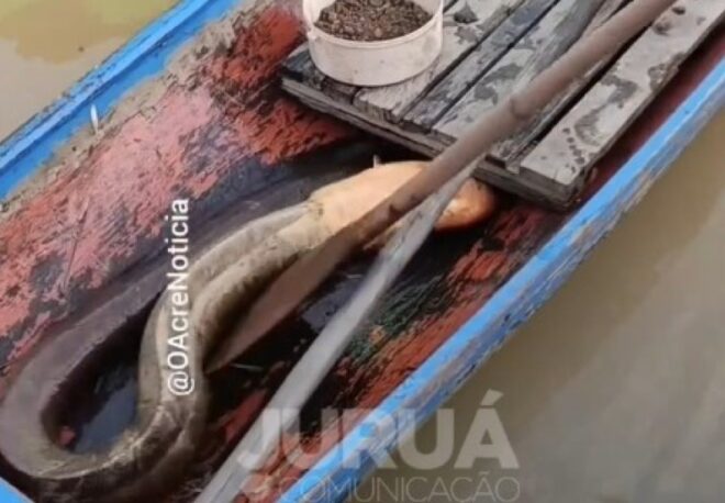 Durante a cheia do Rio Juruá, que alagou parte do bairro Cruzeirinho em Cruzeiro do Sul, um pescador capturou um peixe-elétrico da espécie popularmente conhecida como poraquê neste domingo, dia 18. O animal foi pescado nas águas escuras do Igarapé São Salvador, em área afetada pela enchente. Questionado sobre o destino do peixe, o homem afirmou que iria prepará-lo para consumo próprio.