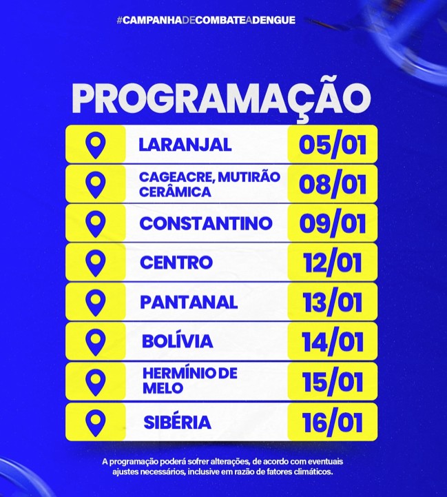 Já a Prefeitura de Brasiléia, na fronteira do Acre com a Bolívia, iniciou 2026 com uma série integrada de ações de melhorias urbanas e combate ao mosquito Aedes aegypti, transmissor da dengue, chikungunya e zika. Por meio da Secretaria Municipal de Obras e do setor de vigilância em saúde, estão sendo realizados mutirões de limpeza, retirada de entulho, visitas domiciliares por agentes de endemias e bloqueios químicos em áreas com notificações das doenças.