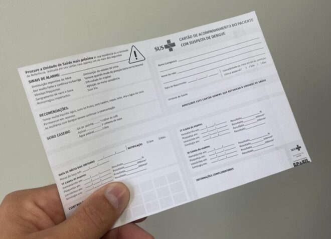 Diante do aumento de casos de dengue durante o período chuvoso de início de 2026, a Secretaria de Estado de Saúde do Acre (Sesacre) está reforçando a emissão do cartão de acompanhamento para pacientes com suspeita ou confirmação da doença. A ferramenta, entregue já no primeiro atendimento, tem como objetivo organizar as informações clínicas, garantir a continuidade do cuidado e auxiliar na tomada de decisão pelos profissionais de saúde.