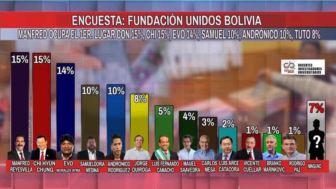 De acordo com o levantamento, Manfred e Chi aparecem empatados na liderança, ambos com 15% das intenções de voto. O ex-presidente Evo Morales surge em terceiro lugar, com 14%, enquanto Samuel e Andrônico dividem a quarta posição, cada um com 10%. Tuto completa a lista, com 8%.
