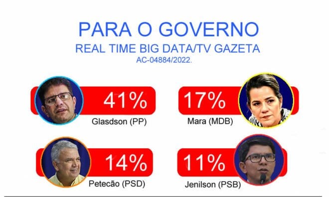 De acordo com o levantamento estimulado, o candidato à reeleição, Gladson Cameli (Progressistas) aparece com 41% na primeira colocação. Na segunda posição, aparece a deputada federal Mara Rocha (MDB) com 17%, seguido pelo senador Sérgio Petecão (PSD) com 14%. O deputado estadual Jenilson Leite (PSB) aparece na quarta colocação com 11%. Nilson Euclides (PSOL) e David Hall (Agir) aparecem com 0%. Branco e nulo somam 9% e não sabem ou não responderam marcou 8%.