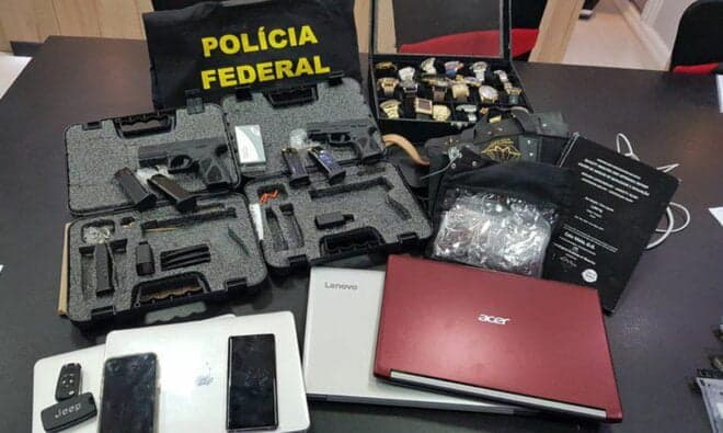 Na ação, foram apreendidos veículos, documentos, joias, telefones celulares, relógios e recolhidos os passaportes dos dois principais investigados. Uma pessoa foi presa em flagrante por posse ilegal de arma de fogo.