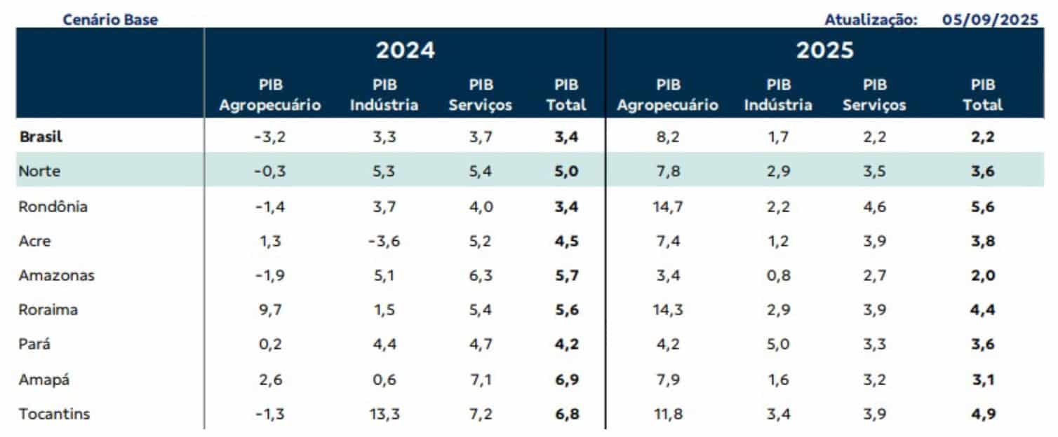 Na Região Norte, que junto com alguns estados do Nordeste e o Centro Oeste puxam a expansão do índice, O Acre supera o Amazonas, com 2%, Pará, com 3,6%, mesmo sediando a COP e Amapá, com 3,1%. O avanço do PIB do Acre está acima do esperado para todo o Brasil, que tem projeção de aumento de 3,6% do PIB.