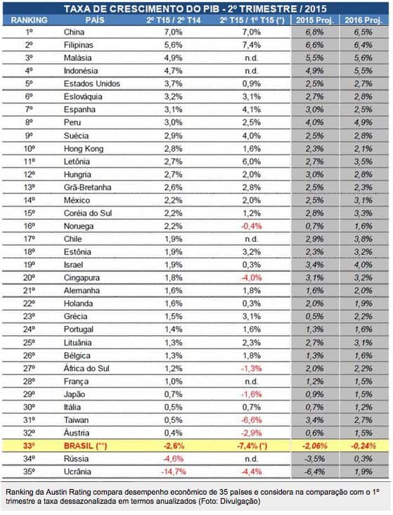 No ranking da Austin Rating, que considera o desempenho na comparação com o mesmo período do ano anterior, o Brasil ficou à frente somente da Rússia e a Ucrânia, que amargaram retração de 4,6% e 14,7%, respectivamente.