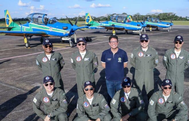Já estão em solo acreano os sete pilotos e as aeronaves do Esquadrão de Demonstração Aérea (EDA), grupamento popularmente conhecido como Esquadrilha da Fumaça. Os integrantes foram recebidos pelo governador Gladson Cameli, nesta quarta-feira, 5, no Aeroporto Internacional de Rio Branco.