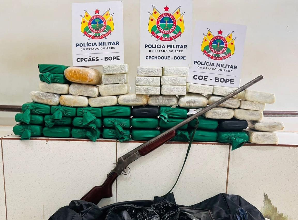 Policiais militares do Batalhão de Operações Especiais (BOPE), incluindo equipes da Companhia de Policiamento com Cães (CPCães), Companhia de Operações Especiais (COE) e Companhia de Choque (CPChoque), apreenderam 58 quilos de entorpecentes e uma espingarda durante uma operação na segunda-feira (5), no bairro Boa União, em Rio Branco.