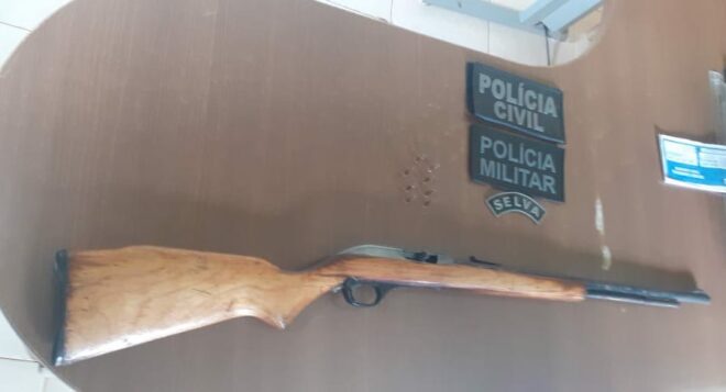 Os policiais encaminharam o envolvido, juntamente com o armamento, à delegacia do município.