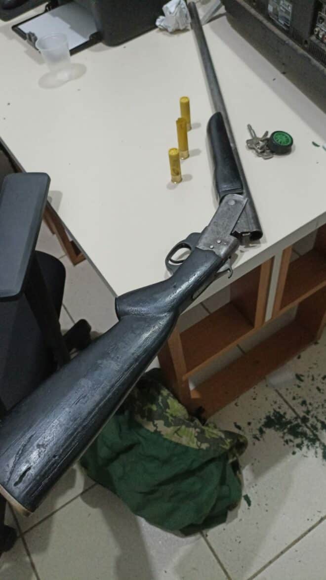 Após uma denúncia anônima informando que haviam dois homens em atitude suspeita, e um deles estava portando uma arma de fogo nas ruas, amedrontando moradores, os militares se deslocaram ao endereço e constataram o fato. Um homem foi preso em posse de uma espingarda calibre 20, com de 3 cartuchos, e um segundo envolvido que estava presente no local e também foi preso.
